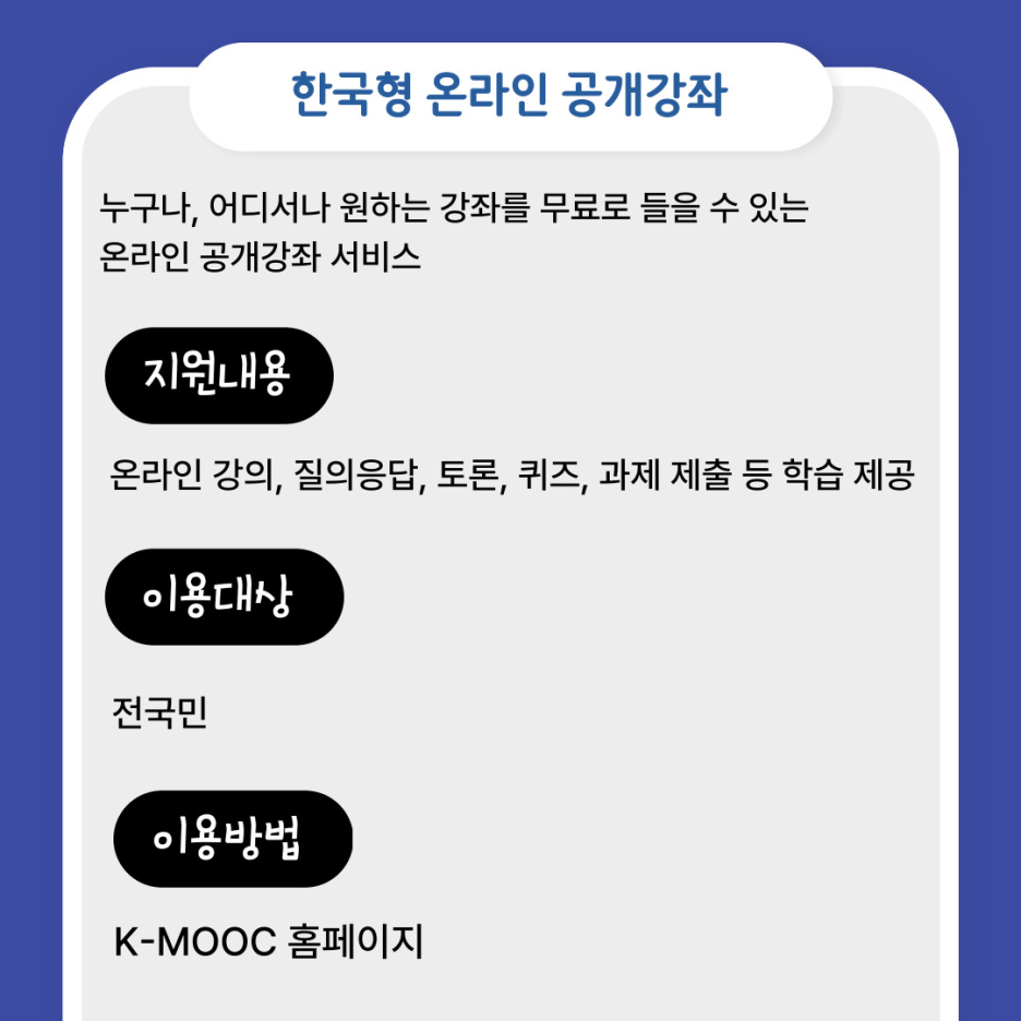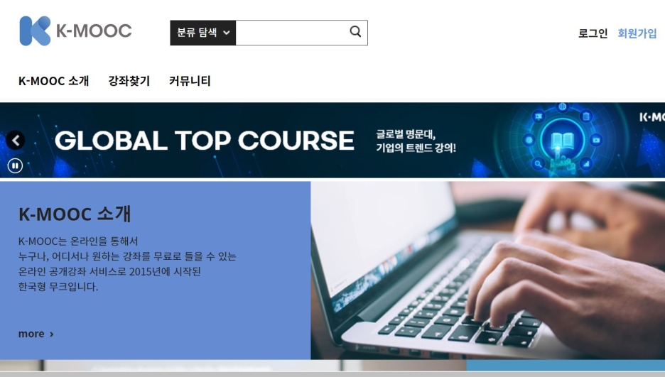 마지막으로 소개할 교육지원은 한국형 온라인 공개강좌인 K-MOOC입니다.