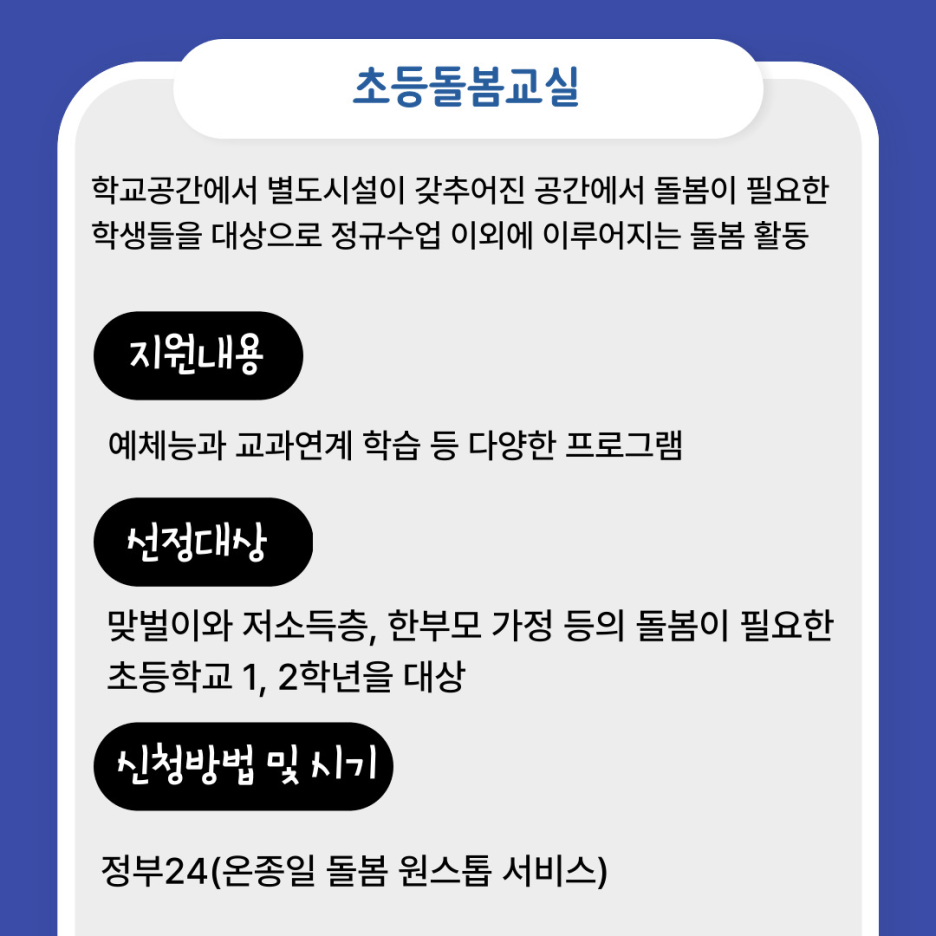 두 번째는 초등돌봄교실입니다. 초등돌봄교실은 돌봄이 필요한 학생들을 대상으로 학교에 별도 시설이 갖춰진 공간에서 정규수업 이외에 이루어지는 돌봄 활동입니다. 돌봄교실은 예체능과 교과 연계 학습 등 다양한 프로그램을 제공하며 아이들의 학습 여건에 맞는 활동 위주로 운영합니다.