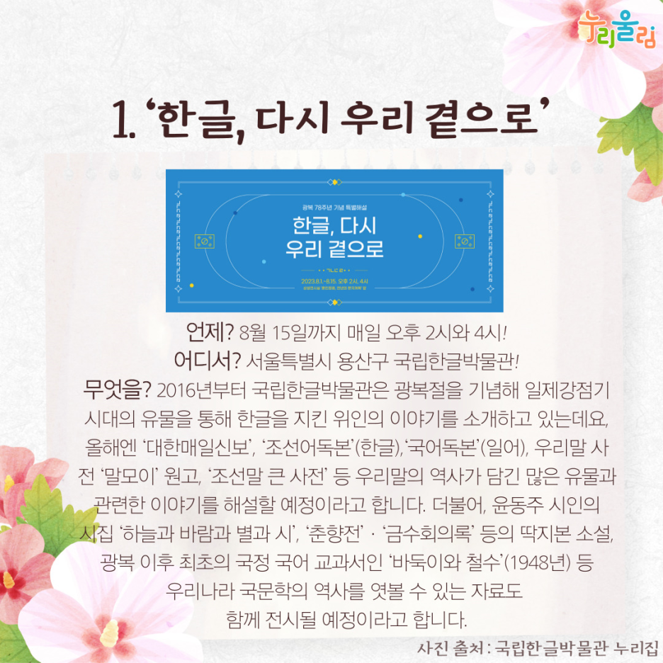 광복절 기념 특별 전시해설인 ‘한글, 다시 우리 곁으로’는 8월 15일까지 매일 14시, 16시 두 차례 진행됩니다. 국립한글박물관은 2016년부터 광복절을 기념해 박물관이 소장한 일제강점기 시대의 유물을 통해 한글을 지켜왔던 분들의 이야기를 들려주고 있는데요.