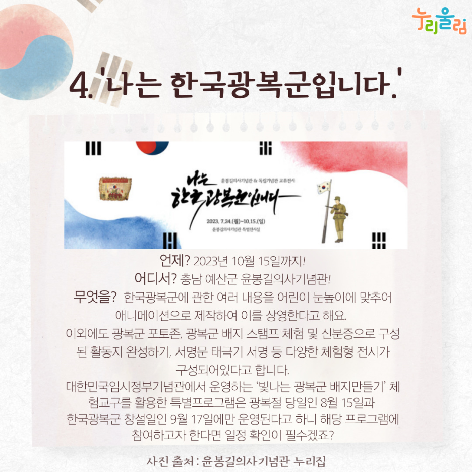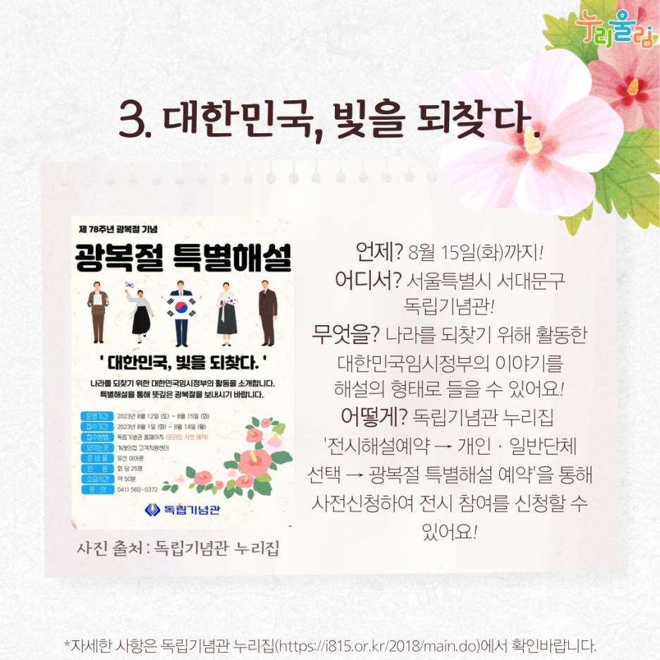 지금까지 광복절 특별 전시와 행사를 함께 알아봤는데요. 광복절 의미를 되새기고 감사한 마음으로 하루를 보내는 건 어떨까요?