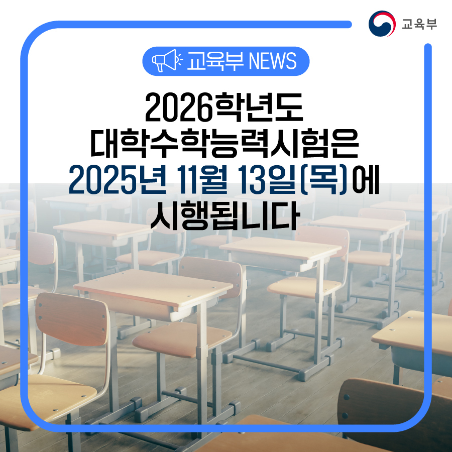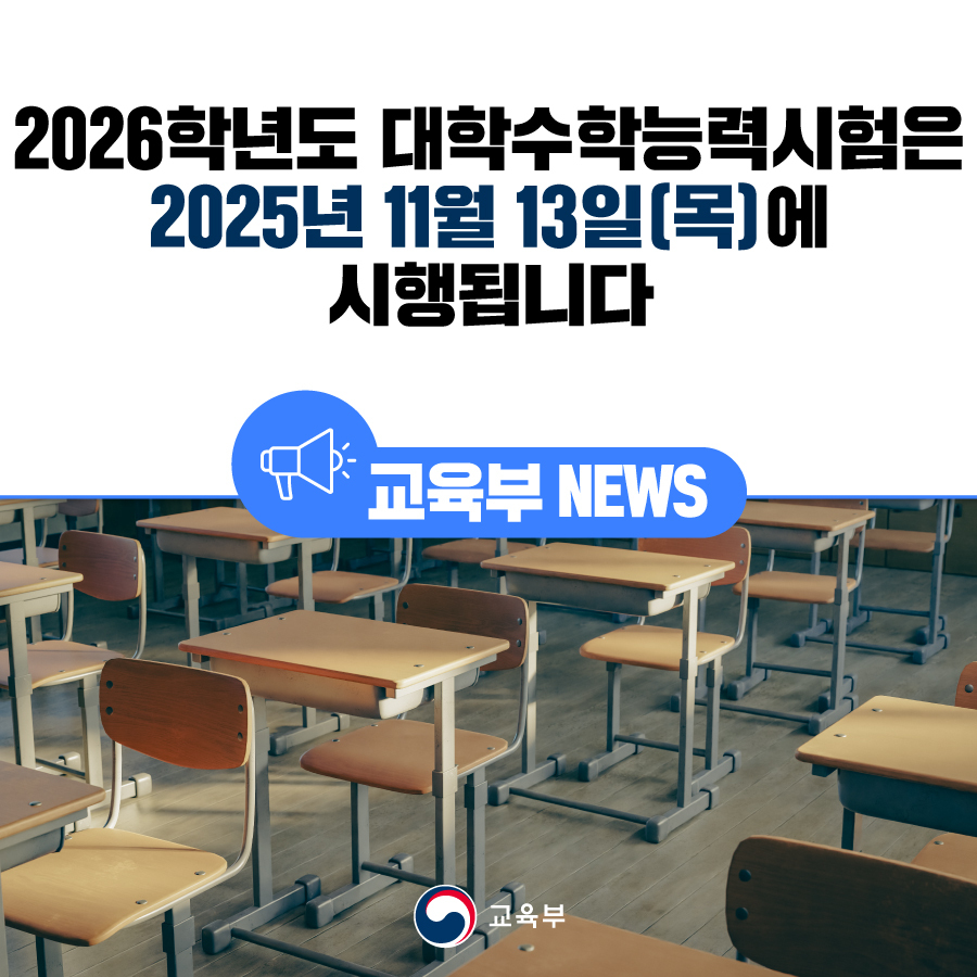 교육부(부총리 겸 교육부장관 이주호)는 8월 17일(목), 2026학년도 수능 시행일, 성적 통지일 및 시험영역 등을 발표하였다.