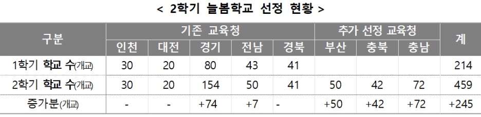 교육부(부총리 겸 교육부장관 이주호)와 8개 시도교육청(부산, 인천, 대전, 경기, 충북, 충남, 전남, 경북)은 이번 2학기부터 459개 초등학교에서 늘봄학교 시범운영을 확대 실시한다. 이는 1학기보다 3개 교육청, 245개교가 더 늘어난 규모이며, 기존 시범운영 중인 경기, 전남 지역에서도 각각 74개교, 7개교가 추가 선정되었다.