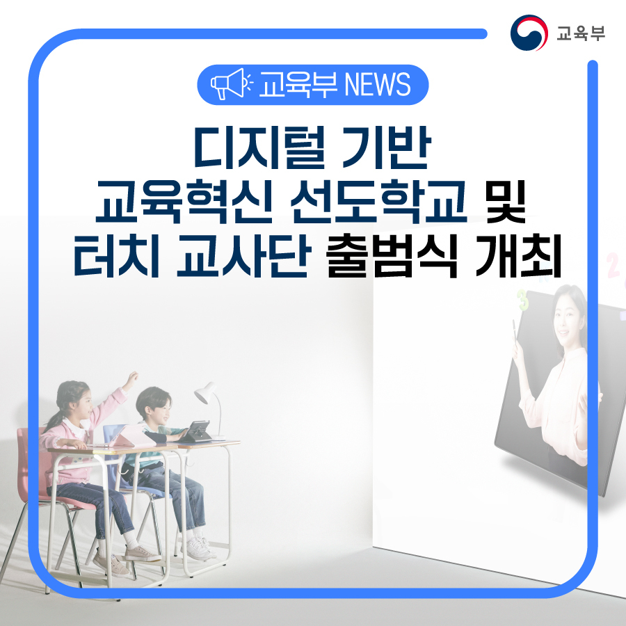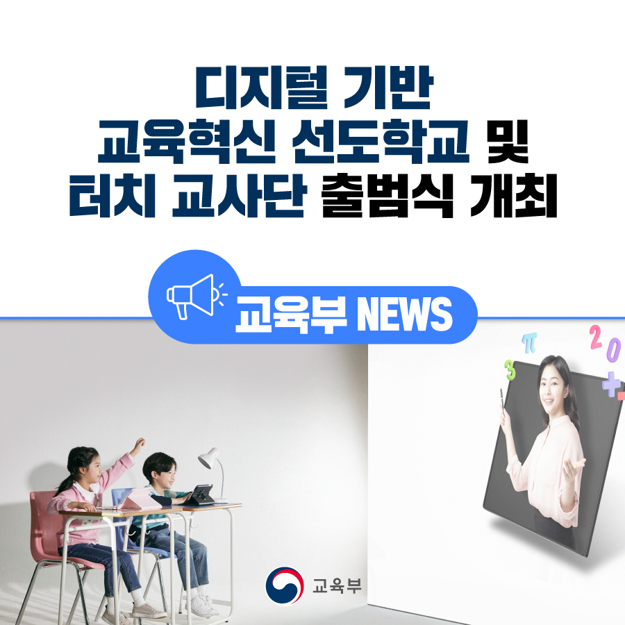 교육부(부총리 겸 교육부장관 이주호)는 17개 시·도교육청, 한국교육학술정보원(원장 서유미)과 함께 8월 25일(금) 서울 코엑스에서 디지털 기반 교육혁신 선도학교(이하 디지털 선도학교)-터치(T.O.U.C.H.) 교사단 출범식을 개최한다.