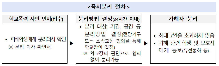 ※ 학교는 분리 시행 전 관련 학생들에게 제도의 취지, 기간, 출결, 이후 사안처리 절차 등에 대해 충분한 설명을 하여야 함