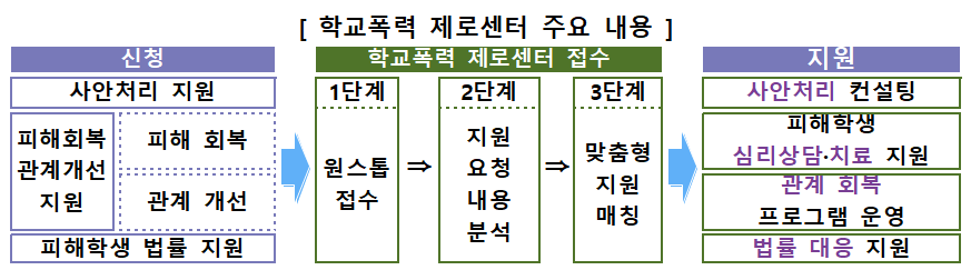 아울러, 9월부터 12월까지 총 8개의 시도교육청에서 ‘학교폭력 제로센터’를 시범 운영한다. 단위학교 및 학교폭력 피해학생은 단 한 번의(One-stop) 신청을 통해 학교폭력 사안 처리, 피해학생 상담·치료, 피·가해학생 관계 개선, 피해학생 법률서비스 등 다양한 맞춤형 지원을 제공받을 수 있다.