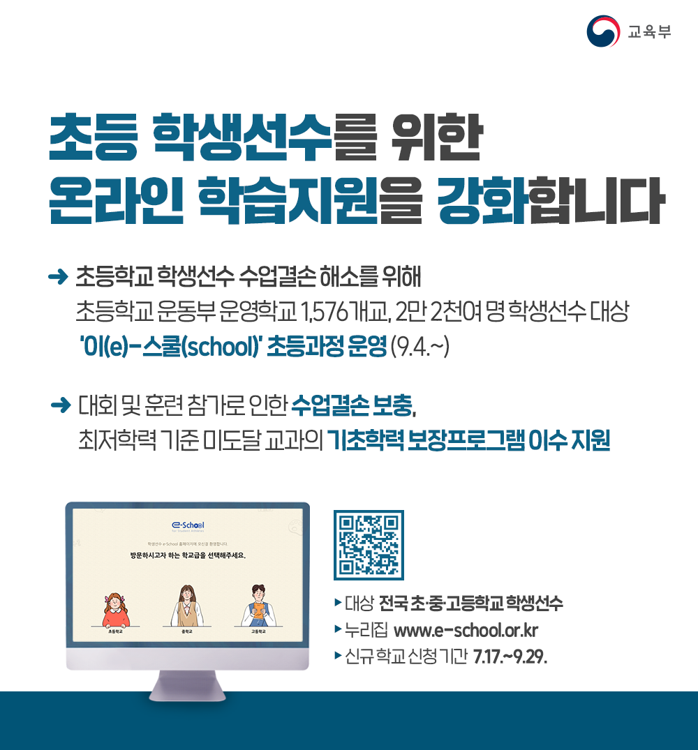 ✅ 초등학교 학생선수 수업결손 해소를 위해 '이(e)-스쿨(school)'초등과정 운영(9.4.~)