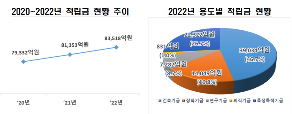 2022년 일반 사립대학의 교비회계 적립금*은 8조 3,518억원(결산 기준)으로 전년(8조 1,353억원)보다 2,165억원(2.7%) 증가했다.
