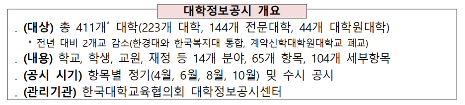 대학별 세부적인 공시자료는 8월 31일(목) 09시부터 대학알리미 누리집(https://www.academyinfo.go.kr)에 공시될 예정이다.