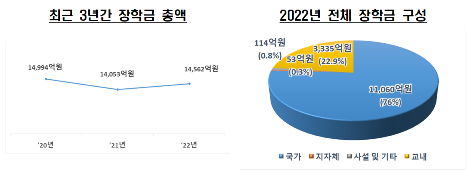 (전체 장학금) 2022년 전문대학의 장학금 총액(결산 기준)은 1조 4,562억원으로 전년(1조 4.053억원)보다 509억원(3.6%) 증가했다.