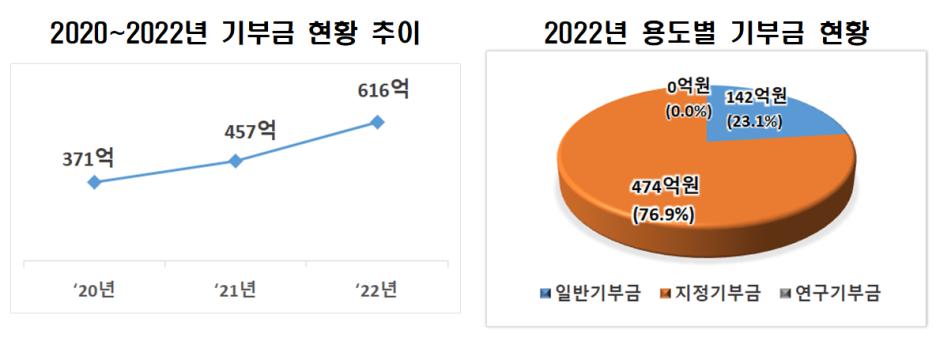 2022년 일반 사립대학의 기부금은 6,788억원(결산 기준)으로 전년(5,737억원)보다 1,051억원(18.3%) 증가했다.