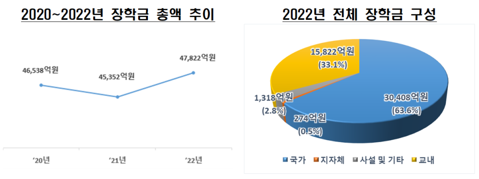 (전체 장학금) 2022년 일반 및 교육대학의 장학금 총액(결산 기준)은 4조 7,822억원으로 전년(4조 5,352억원)보다 2,470억원(5.4%) 증가했다.