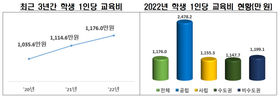 - 4년제 일반 및 교육대학(193개교)의 학생 1인당 교육비는 1,850.8만원으로 전년보다 147.5만원(8.7%) 증가