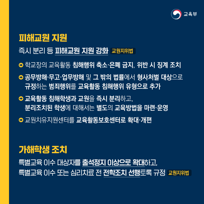 즉시 분리 등 피해교원 지원 강화 (교원지위법)