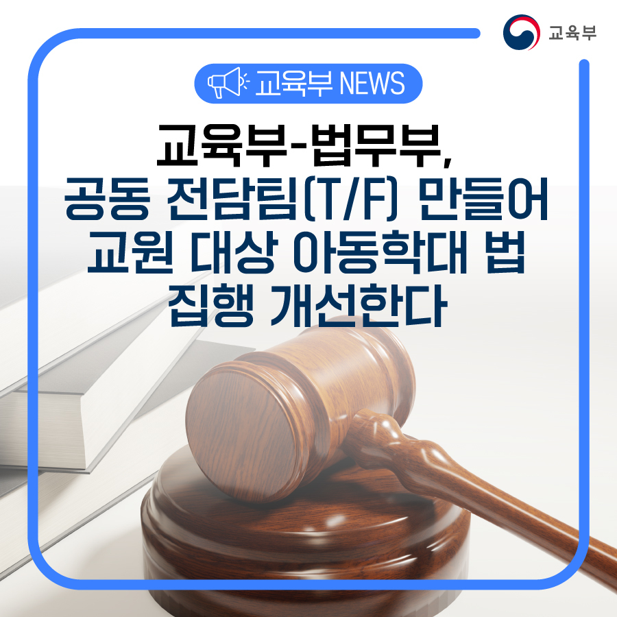 교육부(부총리 겸 교육부장관 이주호)와 법무부(법무부장관 한동훈)는 정상적인 교육활동 보장을 호소하는 현장 교사들의 의견을 반영하고, 교사의 정당한 교육활동이 아동학대로 신고되는 현실을 개선하기 위하여 공동 전담팀(T/F)을 구성하기로 9월 2일(토) 합의하였다.