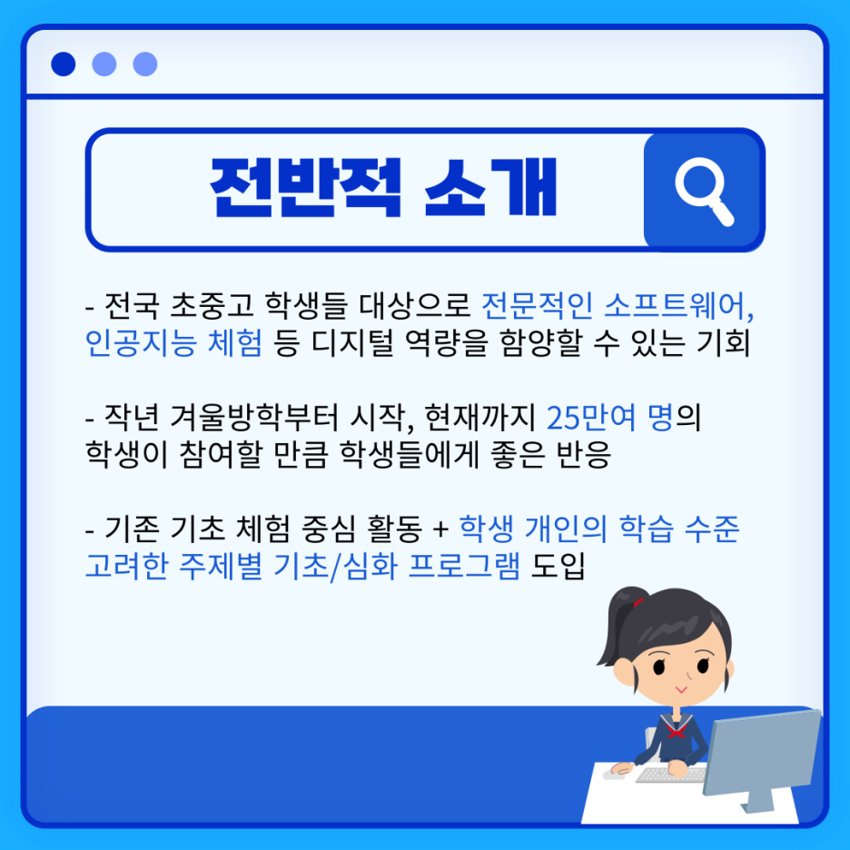 소프트웨어와 인공지능을 체험하고 디지털 역량을 함양할 수 있는 교육 프로그램을 아시나요? 바로 디지털새싹 캠프입니다. 교육부와 17개 시도교육청, 한국과학창의재단이 함께 2022년 겨울방학부터 운영하고 있습니다.