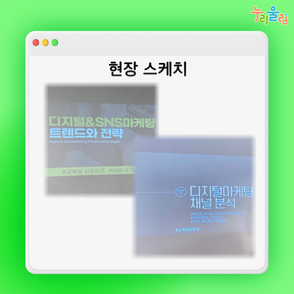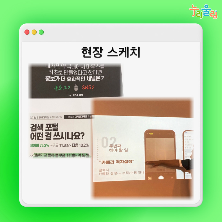 교육 내용이 유익해 몰입도가 높았고, 지루하지 않게 들을 수 있었습니다. 이후에는 카드뉴스, 영상 제작에 도움 되는 실습을 진행했고, 평소에 사용하지 않았던 툴과 앱을 활용해 보니 신기하고 재미있어 교육 이후에도 툴을 사용해 콘텐츠 제작을 하고 툴을 익혔습니다.