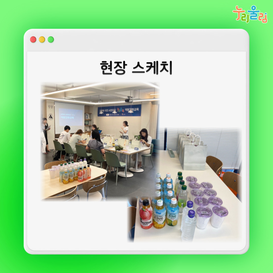 장소에 도착해 벽에 걸린 역량강화 교육 현수막을 본 순간, 이번 교육에 집중해 200%의 경험을 얻어 가야겠다는 의욕이 생겼습니다. 또한, 서포터즈를 위한 다과와 음료가 준비되어 있어 더운 여름, 시원하게 교육받을 수 있었습니다.