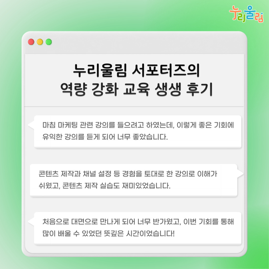 역량강화 교육 이후 참여한 서포터즈분들이 교육에 대한 소감과 의견을 주셨는데요. 마케팅 강의를 듣기 위한 계획을 세우고 계셨는데 유익한 강의를 듣게 되어 만족스러우셨다는 의견이 있었습니다. 더불어, 대면으로 만나 많은 정보를 얻을 수 있는 뜻깊은 시간이 되었다는 후기도 남겨주셨습니다.