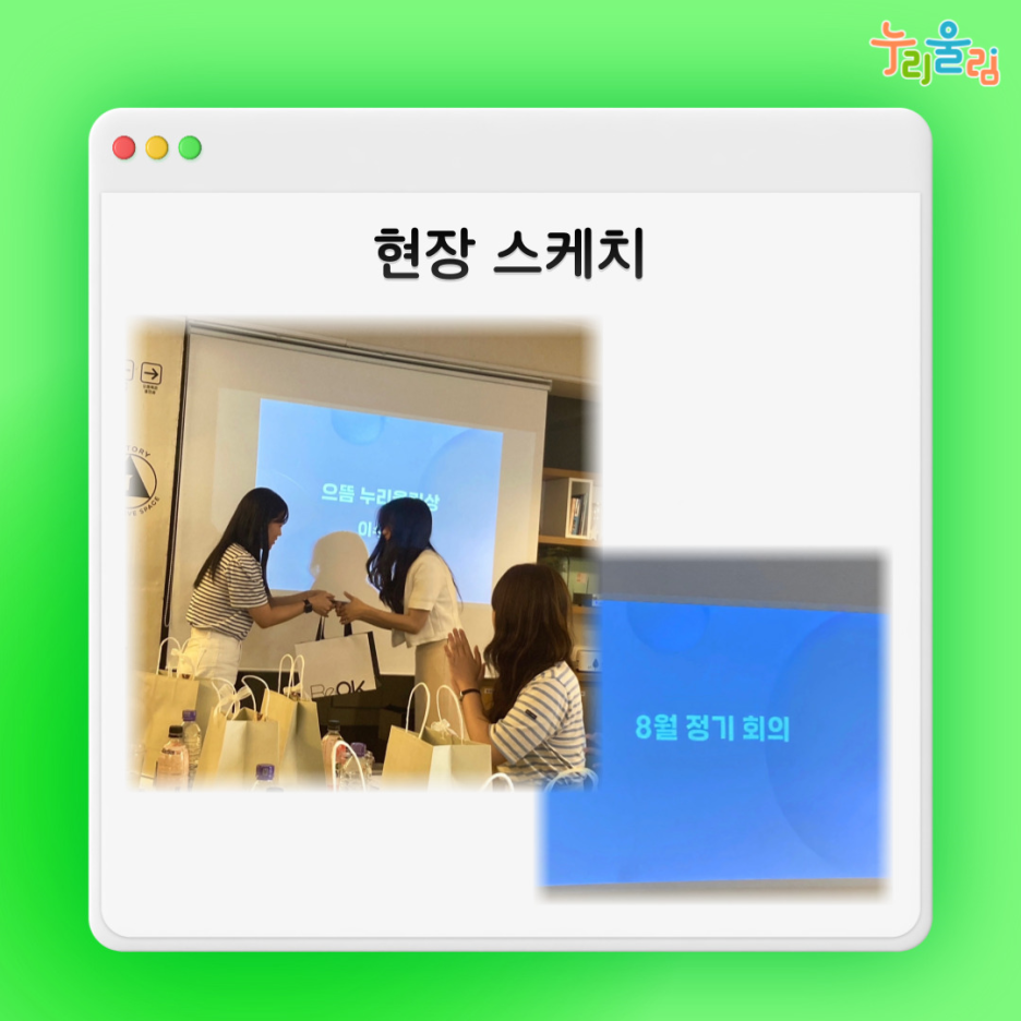 마지막으로 중간 우수활동자 발표가 있었는데요. 서포터즈분들이 열심히 활동한 모습을 보니 저도 남은 활동에 대한 의지가 샘솟았습니다. 그리고 8월 정기회의를 진행하며 교육부 콘텐츠 피드백과 주제 선정에 대한 이야기를 나눴고, 역량강화 교육이 마무리되었습니다.