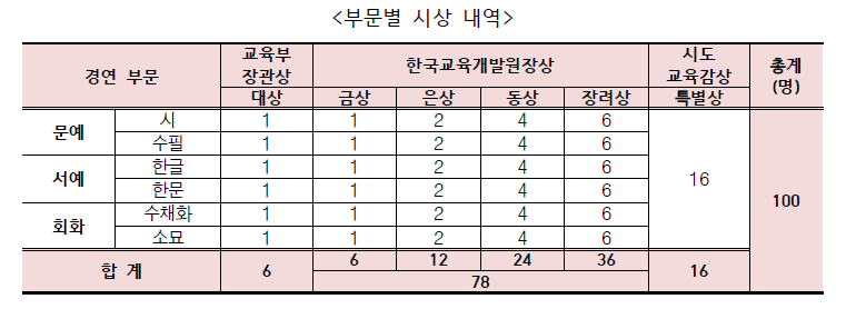 - 문예(시, 수필), 서예(한글, 한문), 회화(수채화, 소묘) 6개 부문의 수상자에게 상장(총 100점)을 수여