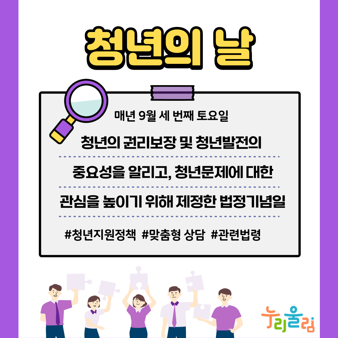 바로, 미래를 이끌어나갈 청년을 위한 법정기념일로 ‘청년의 날’입니다. 청년의 날은 청년의 권리보장 및 청년 발전의 중요성을 알리고, 청년 문제에 대한 관심을 높이기 위해 제정된 날입니다.