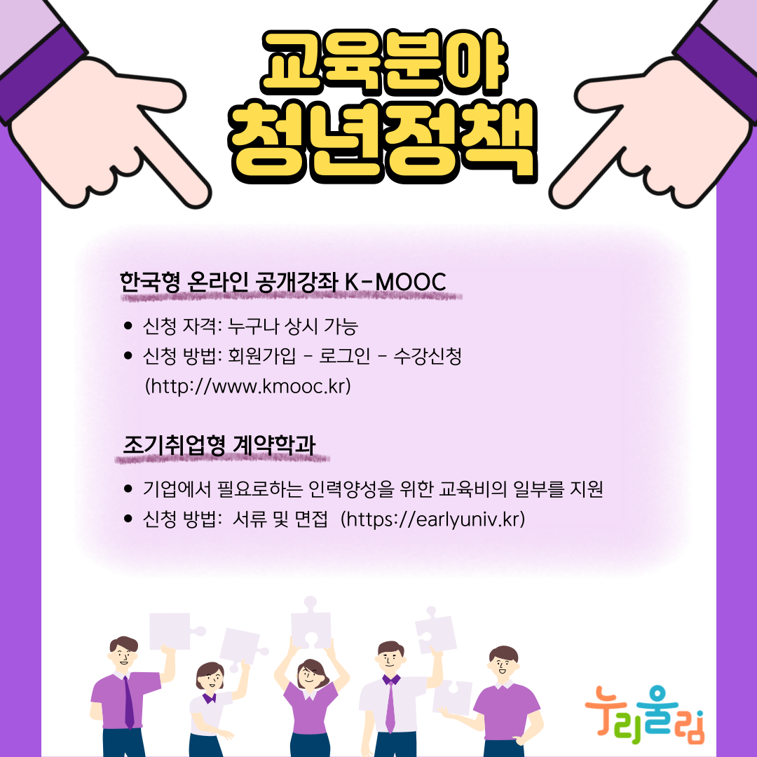 올해 4회를 맞이한 청년의 날은 기념식부터 관련 축제, 프로그램 등 다양한 행사와 정책들이 진행되는데요. 그럼, 교육분야 청년정책은 어떤 내용이 있는지 함께 확인해볼까요?