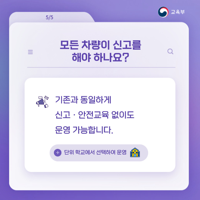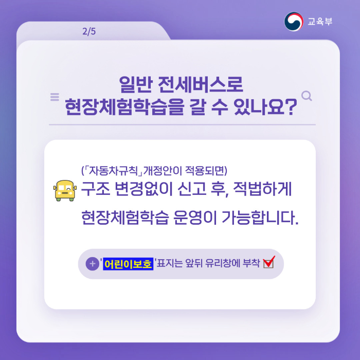 (「자동차규칙」개정안이 적용되면) 구조 변경없이 신고 후, 적법하게 현장체험학습 운영이 가능합니다.