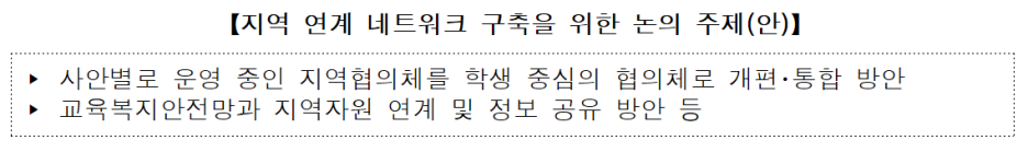 - 사안별로 운영 중인 지역협의체를 학생 중심 협의체로 개편・통합하는 방안 등 논의
