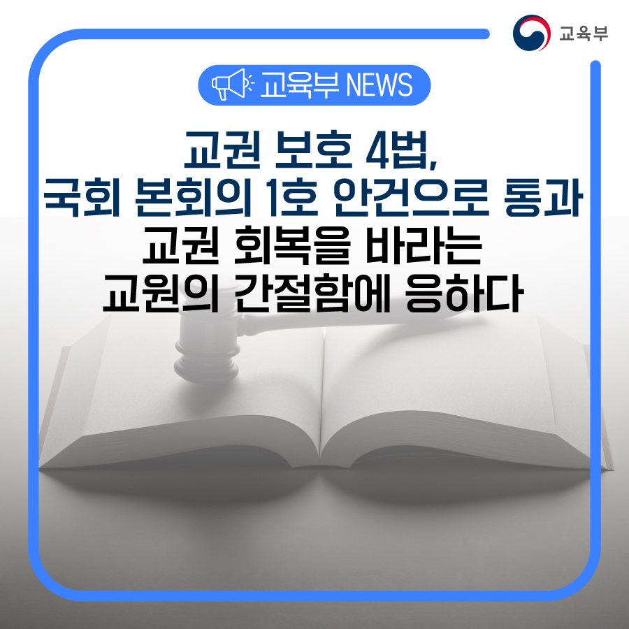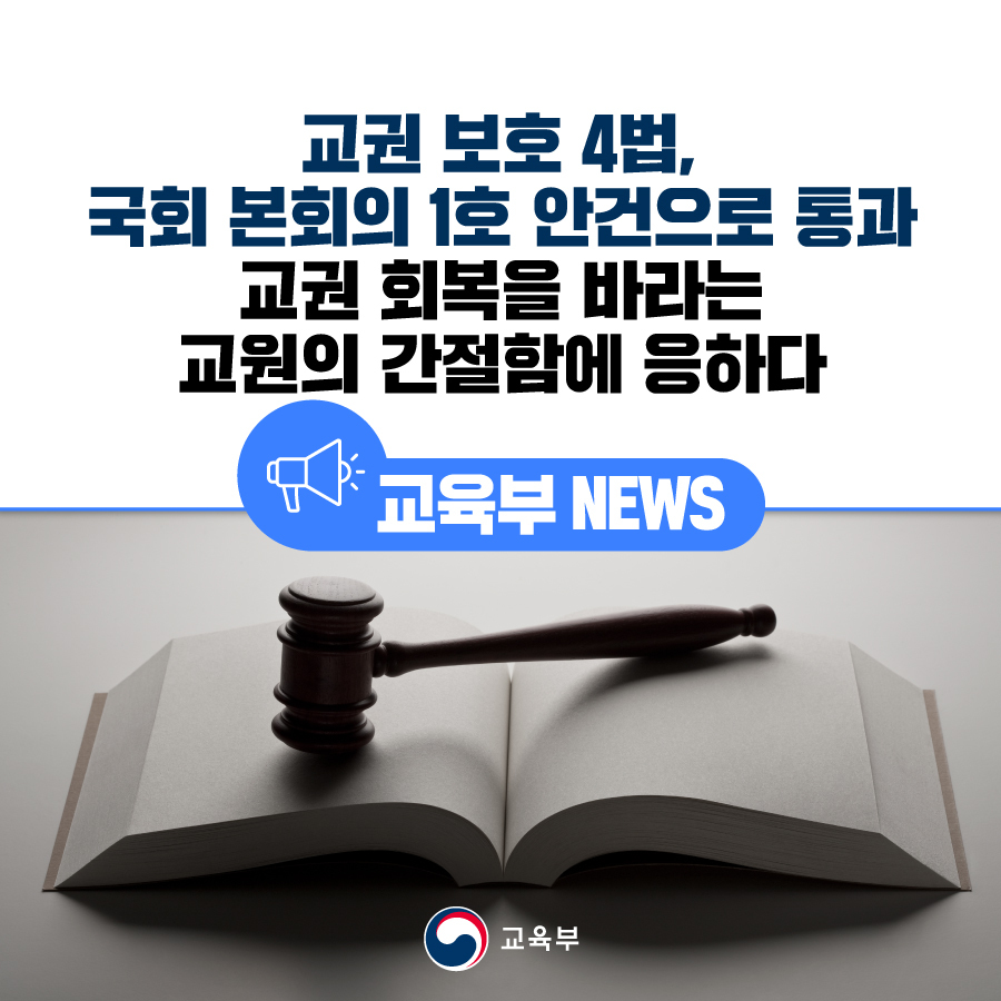 그간 교육부는 ‘여·야·정·시도교육감 4자 협의체’ 구성·운영에 적극적으로 임하고 관계부처와 지속적인 협의를 거치는 등 신속한 교권 보호 입법을 위해 다각적인 노력을 기울여 왔다. 교권 보호 4법 개정법률안은 5차례의 교육위원회 법안심사소위원회를 거쳐 최종적으로 통과되었다.