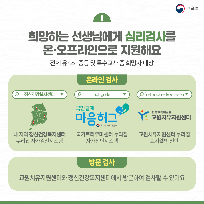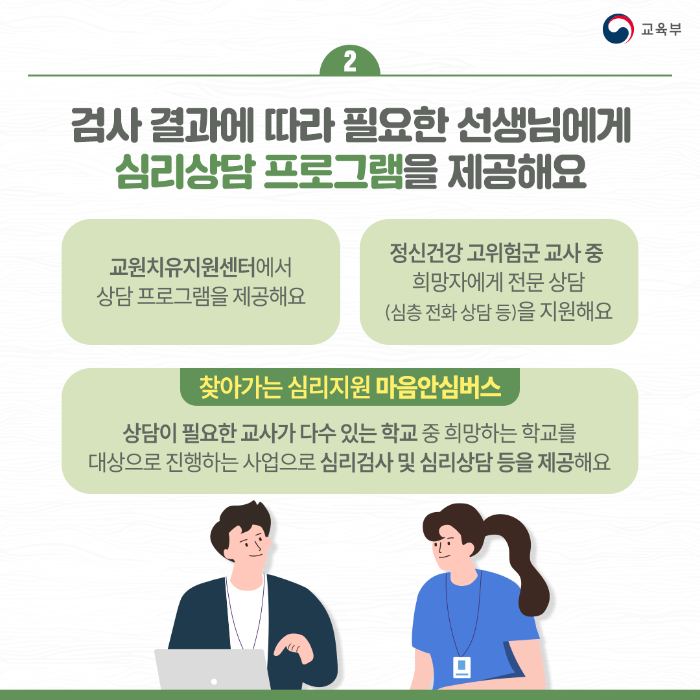 - 정신건강 고위험군 교사 중 희망자에게 전문 상담(심층 전화 상담 등)을 지원해요