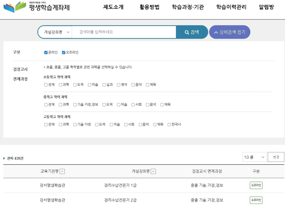 그리고 검정고시를 준비하는 사람들은 <학습과정·기관>에서 검정고시 연계를, 배움을 원하는 사람들은 <학습과정 정보>를 검색하면 됩니다. 이때, 학습과정 정보에서 배우는 과목(개설강좌명)과 학습방법(온라인·오프라인)이 다르니 꼭 확인 바랍니다.