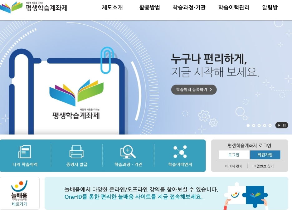 오늘은 평생학습 정보를 하나로 모아 관리할 수 있는 평생학습계좌제 누리집을 소개하려고 합니다.