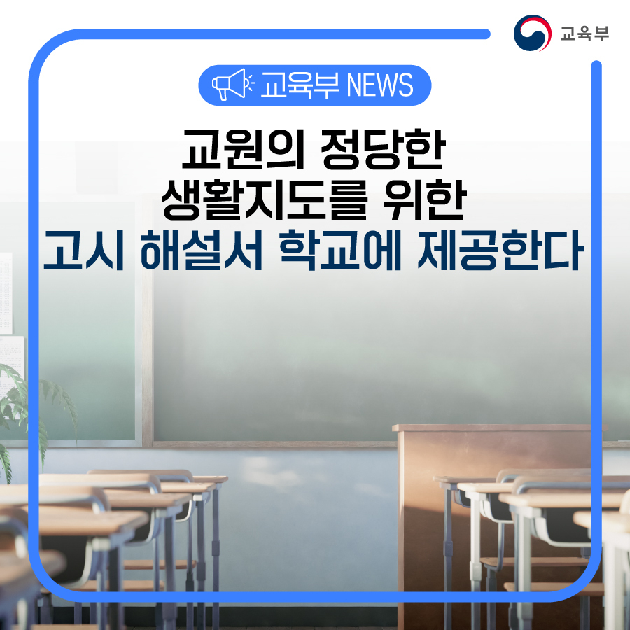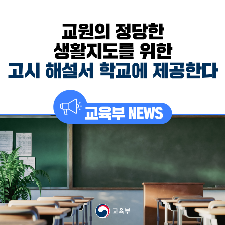 지난 9월 1일 「교원의 학생생활지도에 관한 고시」를 공포·시행하였고, 교사들이 고시에 근거한 정당한 생활지도를 하는 데 어려움이 없도록 고시의 구체사항 등을 담은 해설서 마련을 추진해 왔다.