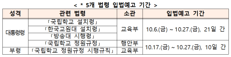- 「국립학교 설치령」 등 5개 법령 입법예고를 거쳐 11월 내 제도 개선 완료