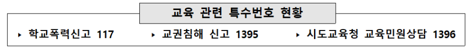 교육부는 교권침해로부터 교원을 보호하기 위해 「교권 회복 및 보호 강화 종합방안」(2023.8.) 등 다양한 정책을 추진하고 있다. 이 과정에서 교원이 다양한 교권침해 상황에서 즉시 도움을 요청할 수 있도록 학교폭력신고 117, 교육민원상담 1396*과 같은 통합시스템 구축의 필요성이 지속 제기되어 왔다.