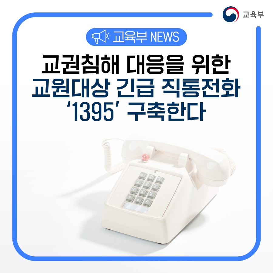 이에, 교육부와 과기정통부는 교원이 악성민원, 형사고발, 우울감 등 다양한 위기 상황에서 즉시 도움을 요청할 수 있는 통합시스템 구축의 필요성에 인식을 같이 하고, 교원만이 사용할 수 있는 특수번호 ‘1395’를 활용한 직통전화(핫라인)를 구축하기로 합의하였다.