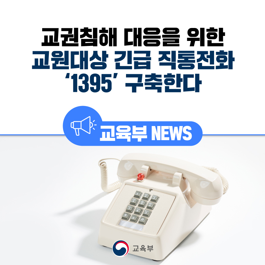 교육부(부총리 겸 교육부장관 이주호)와 과학기술정보통신부(장관 이종호, 이하 ‘과기정통부’)는 10월 10일(화), 교원이 악성민원 등 교육활동 침해 사항을 즉시 신고할 수 있도록 ‘1395’를 교권침해 신고 특수번호*로 사용하기로 합의하였다.