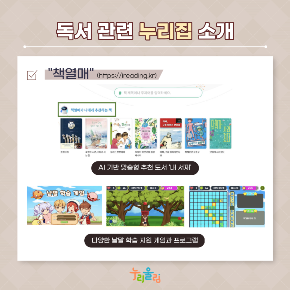 로그인 후 [내 서재]를 클릭하면 인공지능의 도서 추천을 확인할 수 있는데요. 단순히 관심 주제 도서를 추천하는 것이 아니라 비슷한 학년, 학생 수준을 고려해 맞춤형 독서를 진행할 수 있습니다. 이뿐만 아니라 재미있는 국어교육을 위해 낱말 게임과 단어 학습 퍼즐 등 다양한 학습지원 프로그램도 있습니다.