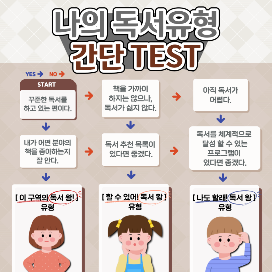 먼저, 간단한 독서유형 테스트를 준비했습니다. ‘꾸준한 독서를 하고 있는 편이다’를 시작으로 화살표를 따라 독서유형을 확인해 주세요!