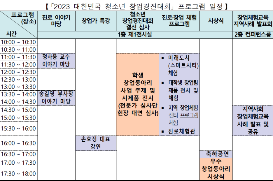 교육부(부총리 겸 교육부장관 이주호)와 17개 시도교육청은 한국청년기업가정신재단(이사장 남민우)과 함께 「2023 대한민국 청소년 창업경진대회」 최종 결선 및 시상식을 10월 19일(목), 서울무역전시컨벤션센터(SETEC)에서 개최한다.