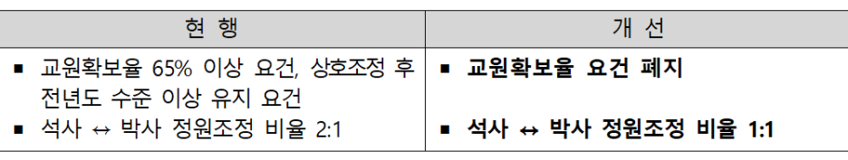 아울러, 총 정원 범위 내에서도 대학 여건 및 필요에 따라 학사·석사·박사 학생 정원 조정이 원활히 이루어질 수 있도록 대학원 정원 상호조정 기준을 완화한다(※수도권에도 공통 적용). 이를 통해 학부에서 대학원으로의 정원 조정 등 대학 내 기능·구조 개편이 활발히 이루어질 것으로 기대된다.