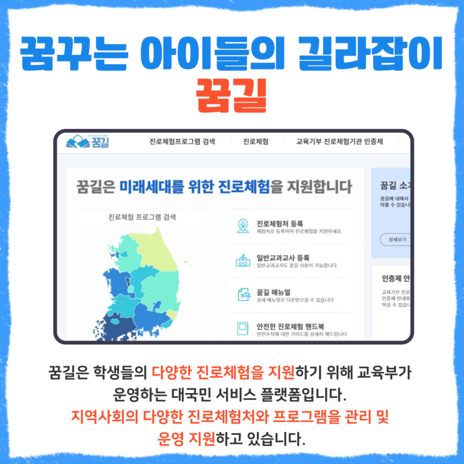 꿈길을 통해 학생들이 직접 직업을 체험하며 다양한 직업인의 삶을 경험할 수 있는데요. 진로체험 지원센터를 통해 다양한 프로그램을 체험할 수 있습니다. 현장직업체험형, 직업실무체험형, 현장견학형 등 다양한 진로체험 유형이 있으니, 아래 누리집을 통해 확인해주세요.