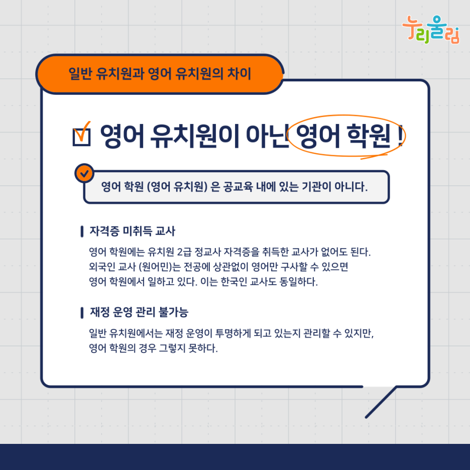 이후 장관님과 패널들이 이런 궁금증과 고민에 대해 함께 이야기를 나누며 영어 유치원은 잘못된 표현이라고 설명해주셨는데요. ‘영어 유치원’은 공교육 내에 있는 기관이 아니므로 ‘영어 학원’이라는 표현이 맞고, 영어 학원은 일반 유치원과 반대로 교사 자격증 유무에 대한 관리가 불가능해 유치원 2급 정교사 자격증을 취득한 교사가 없어도 가능한 곳이라고 지적했습니다.