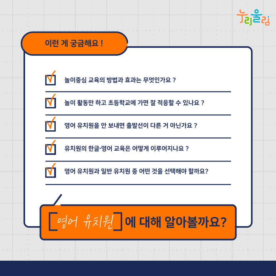 교육을 놀이로만 해도 학교에서 제대로 된 구성원이 될 수 있는지, 일반 유치원에 다니는 아이들이 소위 ‘영어 유치원’에 다니는 아이들보다 뒤처지는 건 아닌지 등 다양한 궁금증과 우려의 목소리를 전해주셨습니다.