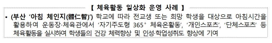 * 아침과 방과후 등 틈새 시간을 활용하여 학생들이 자율적으로 체육활동에 참여할 수 있도록 운동 프로그램 등을 제공해 주고, 체육을 생활화할 수 있도록 유도