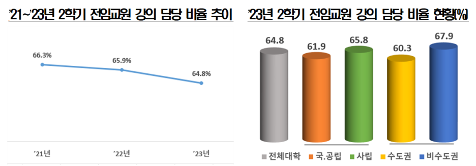 2023년 2학기 전임교원 강의 담당 비율*은 64.8%로 2022년 2학기(65.9%)보다 1.1%p 감소했고, 강사의 강의 담당 비율은 20.3%로 2022년 2학기(20.6%)보다 0.3%p 감소했다.