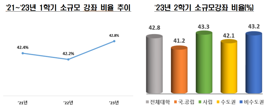2023년 2학기 20명 이하 소규모 강좌 비율은 42.8%로 2022년 2학기(42.2%)보다 0.6%p 증가했다.