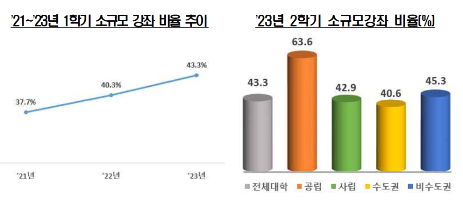 2023년 2학기 20명 이하 소규모 강좌 비율은 43.3%로 2022년 2학기(40.3%)보다 3.0%p 증가했다.