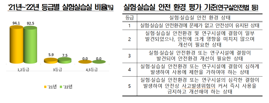 2022년 이공계 및 비이공계 분야 실험·실습실 안전 환경 평가 결과, 1·2등급은 92.5%로 전년 94.1%보다 1.6%p 감소했다.