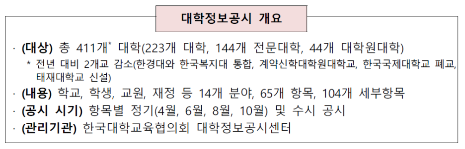 대학별 세부적인 공시자료는 10월 31일(화) 09시부터 대학알리미 누리집(https://www.academyinfo.go.kr)에 공시될 예정이다.